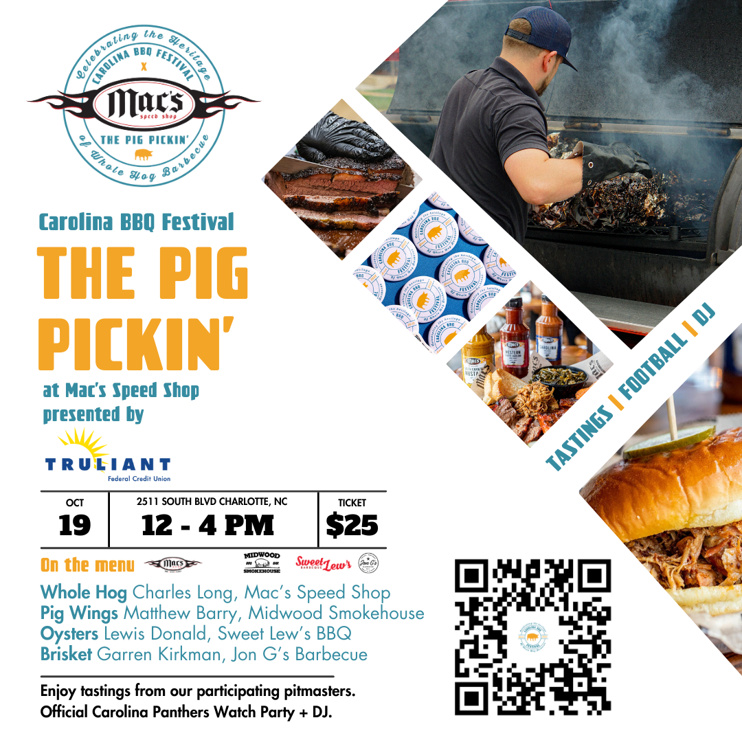 Join us for The Pig Pickin', a Carolina BBQ Festival event celebrating the heritage of whole hog barbecue - hosted by Mac's Speed Shop. For more information and tickets, click the website link below!